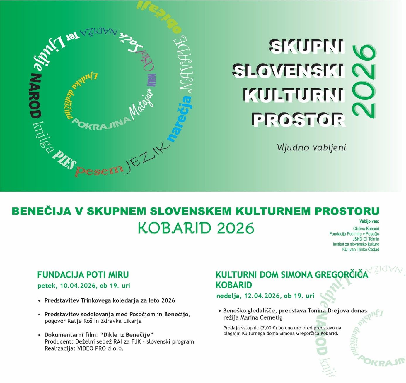 V nedeljo, 12. 4. se Beneški kulturni dnevi zaključujejo s predstavo Beneškega gledališča, ki bo ob 19. uri v Kulturnem domu Simona Gregorčiča v Kobaridu.